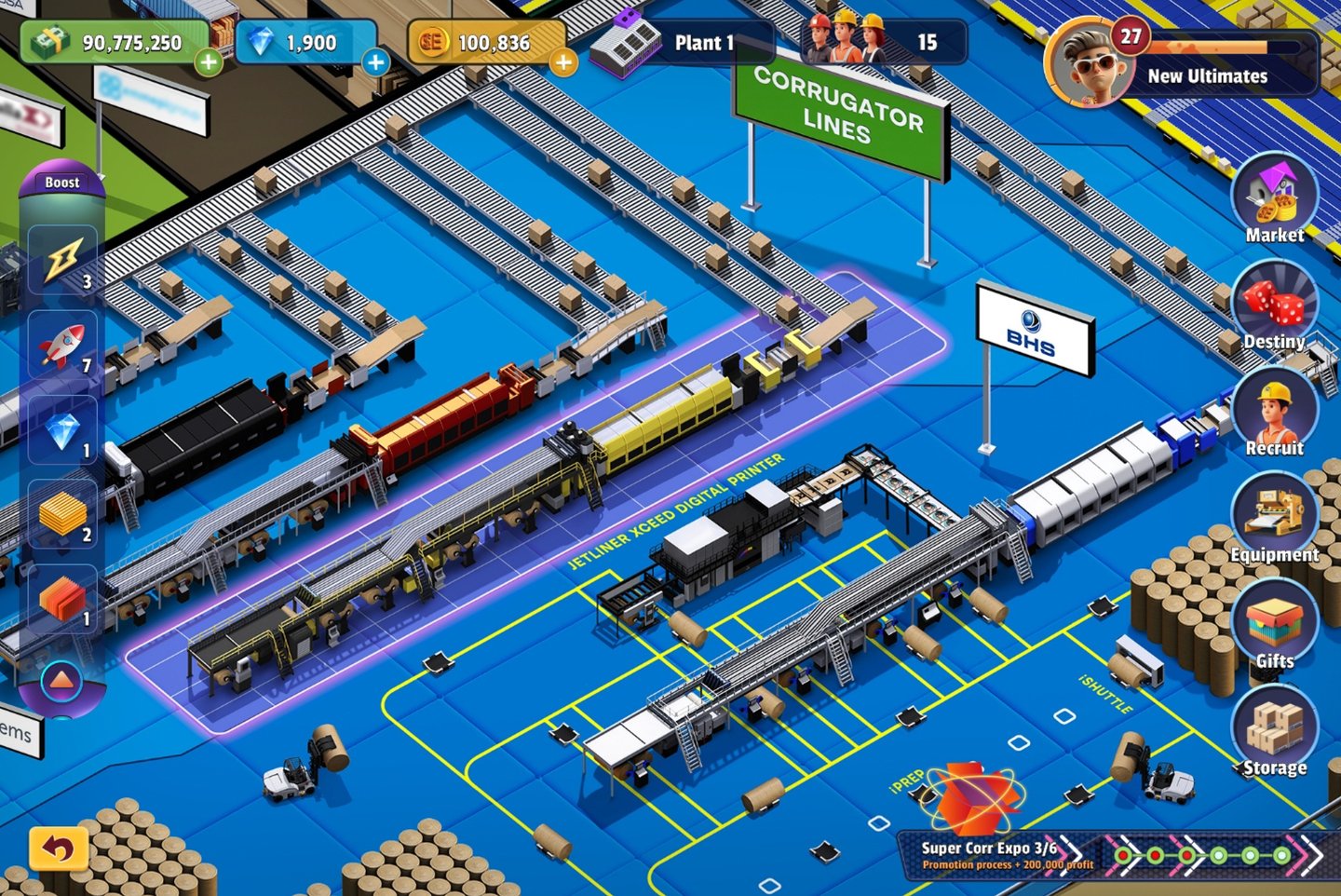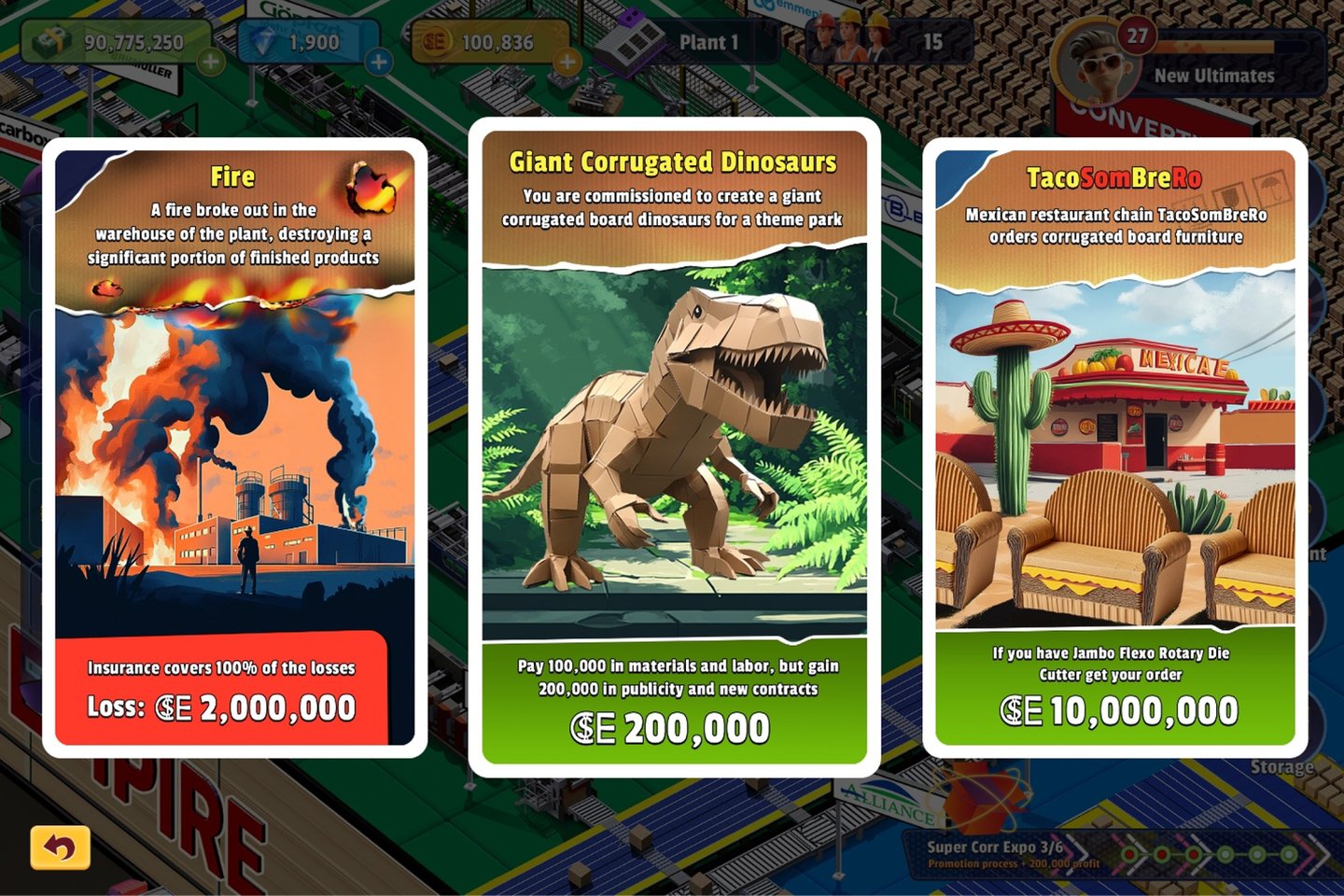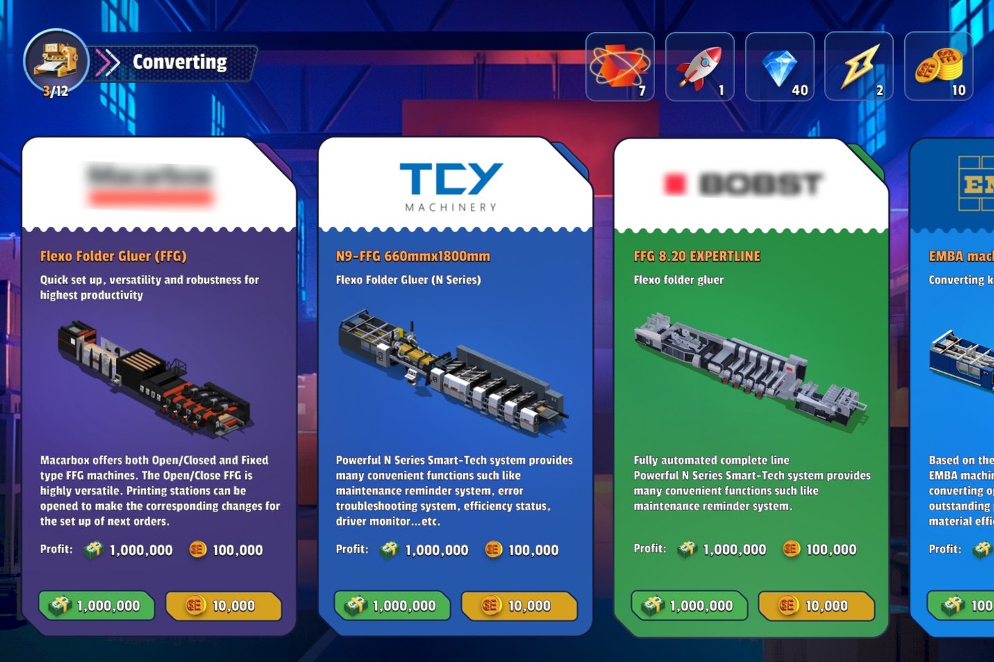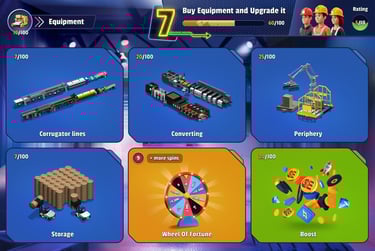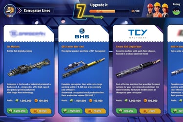 The journey begins with a challenge: the player receives their first order to produce packaging. To fulfill it, they need to acquire the right equipment and materials. As they progress, players purchase machines for printing, die-cutting, and folding corrugated board.